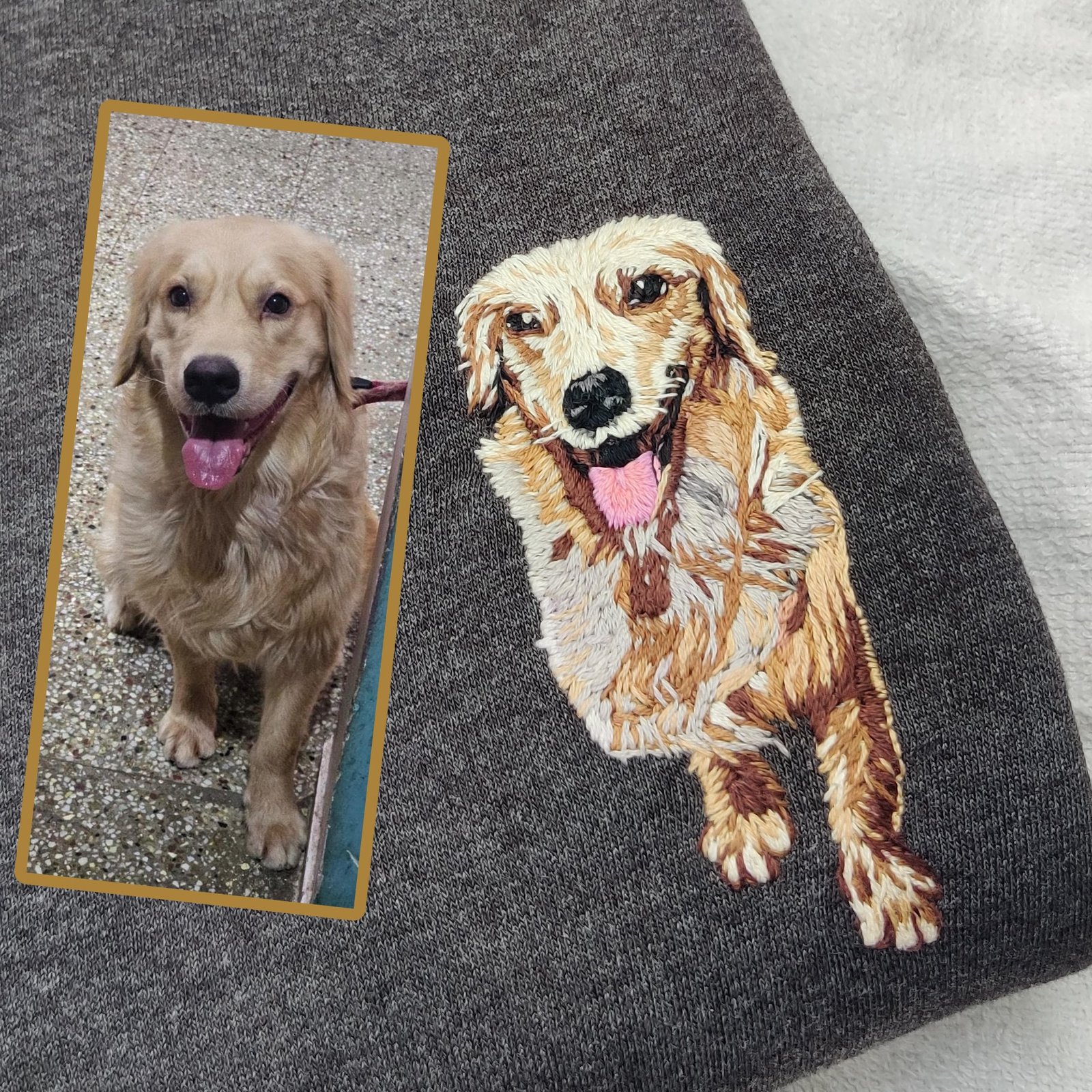 Each piece features a 2.5-inch custom pet portrait, stitched lovingly by hand using Anchor threads. You can personalize it further with a single initial — just a whisper of who they were to you, and still are.